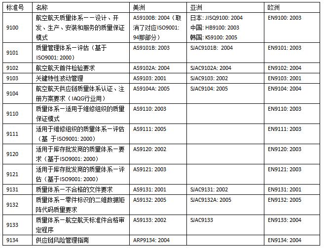 AS9100《質(zhì)量管理體系——航空航天——要求》是依據(jù)ISO9001補充行業(yè)特定要求的國際航空航天質(zhì)量管理體系標(biāo)準(zhǔn),該體系標(biāo)準(zhǔn)由國際航空航天質(zhì)量協(xié)調(diào)組織(IAQG)于2001年組織制定并發(fā)布,它是在ISO9001的基礎(chǔ)上,增加了航空航天工業(yè)的特殊要求,其目的是在世界范圍為航空航天工業(yè)提供統(tǒng)一的質(zhì)量管理體系要求。2009年1月SAE正式頒布了AS9100C版標(biāo)準(zhǔn)。該版標(biāo)準(zhǔn)對B版標(biāo)準(zhǔn)作了較大的修改。修訂后的AS9100標(biāo)準(zhǔn)仍然是采用“A+B”的結(jié)構(gòu),A部分將采用2008版的ISO9001標(biāo)準(zhǔn),B部分是在原來的B部分基礎(chǔ)上又進(jìn)行了修改、補充。